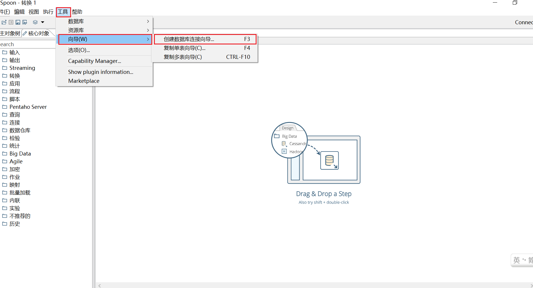 接下来就是在新建的转换当中选择工具->向导->创建数据库连接向导(这一步可以将要读取的数据库和要写入的数据库都配置好,这样在编写对接逻辑的时候就不用在返回来重做这一步了)