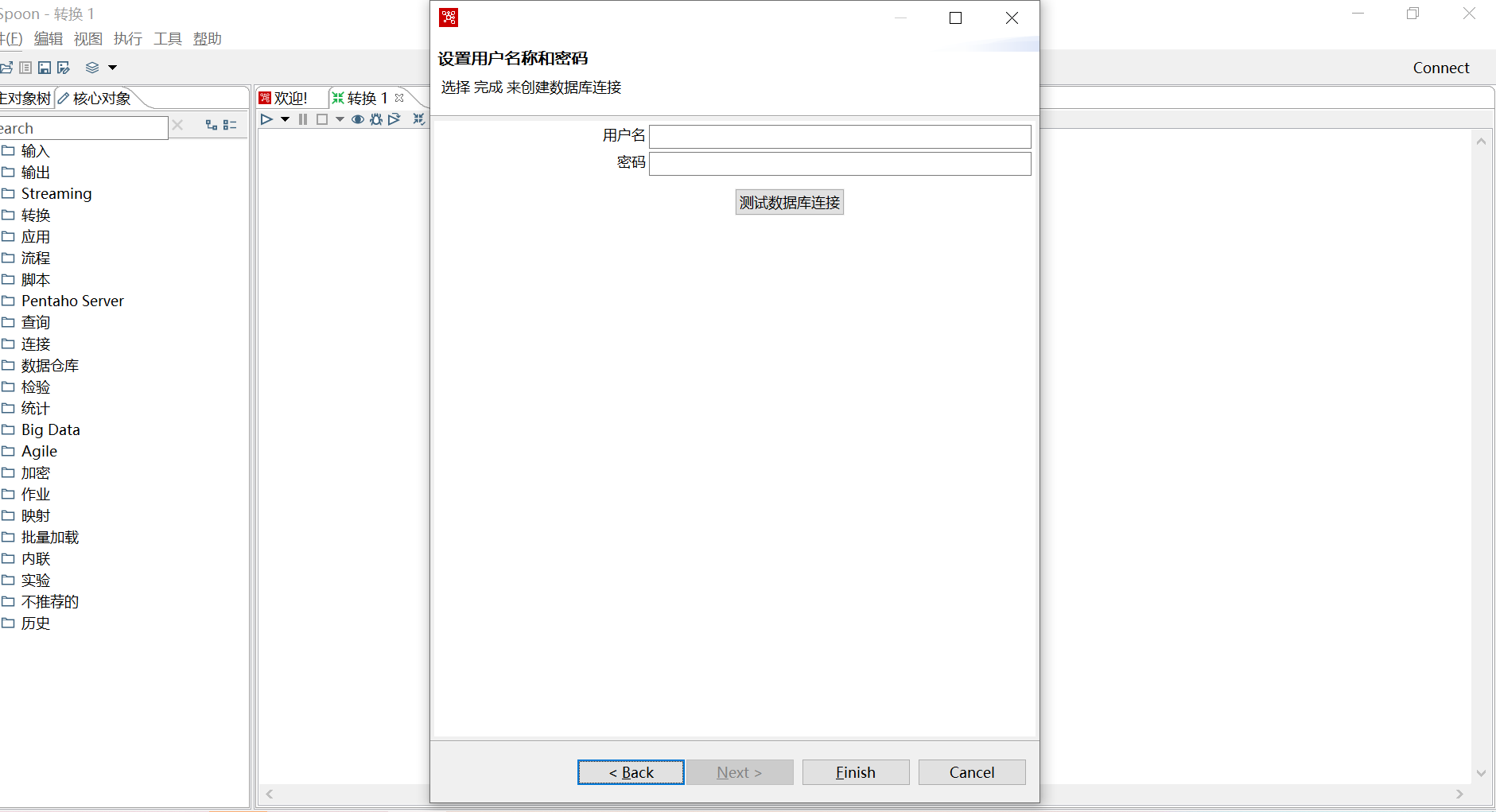在编辑对接程序之前,是需要先设置一下数据库信息的,在这里说明一下,新解压的kettle没有oracle的驱动,需要手动的下载一个ojdbc的jar包放到data-integrationlib目录下,否则测试连接的时候会报错(以oracle的为例,如果是其他数据库请忽略这一步,直接看下边)