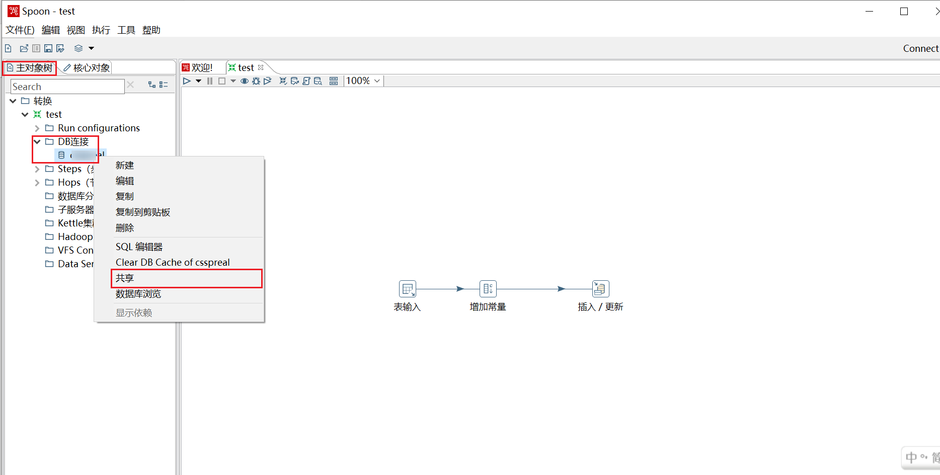 创建好数据库连接后依次点击左侧窗口的主对象树->转换->test(新创建的转换)->DB连接,然后右键创建好的数据库连接,点击共享即可