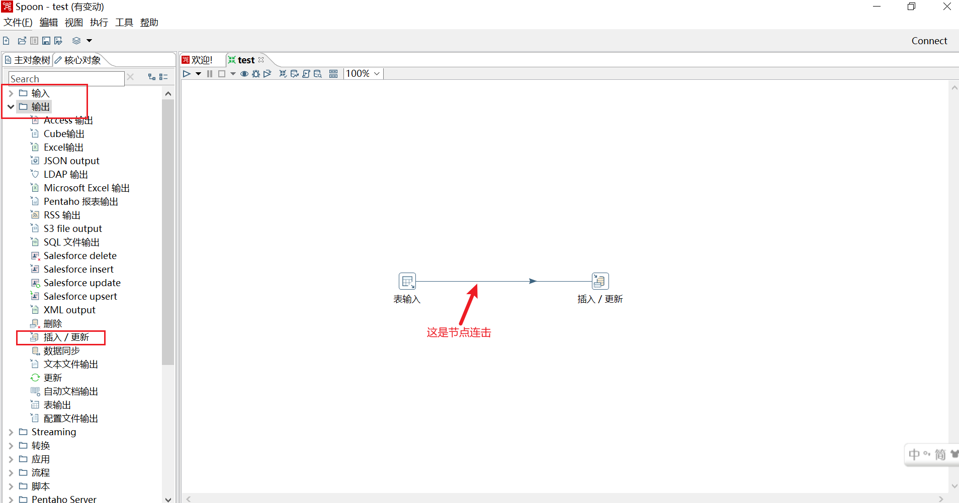 首先在窗口的左侧核心对象下,从输入标签中找到表输入,双击或者拖拽都行,拖拽的话是往右侧转换里拖拽,这个表输入就是要读取的数据,然后关闭输入标签,或者向下滑动,找到输出标签,从输出标签中找到插入/更新,同样以双击或拖拽的方式加入到转换里,这个是要写入的数据,然后按住shift键,先点击表输入,再点击插入/更新,这样这个节点就创建好了