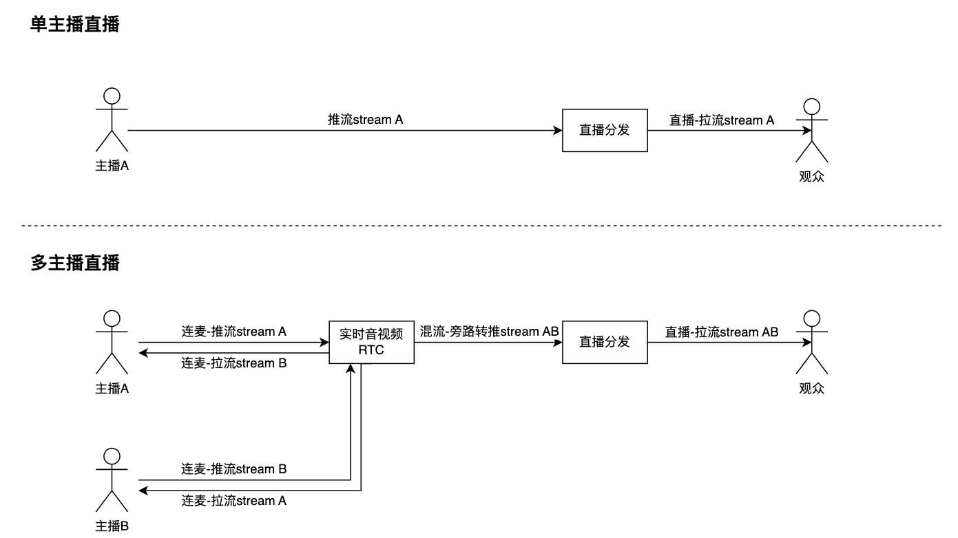 - 单主播直播:最早的直播场景,只有一个主播推流,观众不能与主播连麦互动,只能看主播直播,比如单主播的秀场直播、职业培训这类场景。