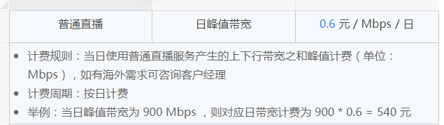 直播服务计费项由两部分组成:日峰值带宽费+增值服务费(可选)