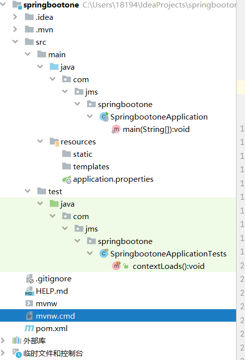 我们可以看到在项目创建好后就自动包含着一个叫做…Application的类,这个类是SpringBoot项目的启动类,运行其中的main方法即可启动SpringBoot项目。