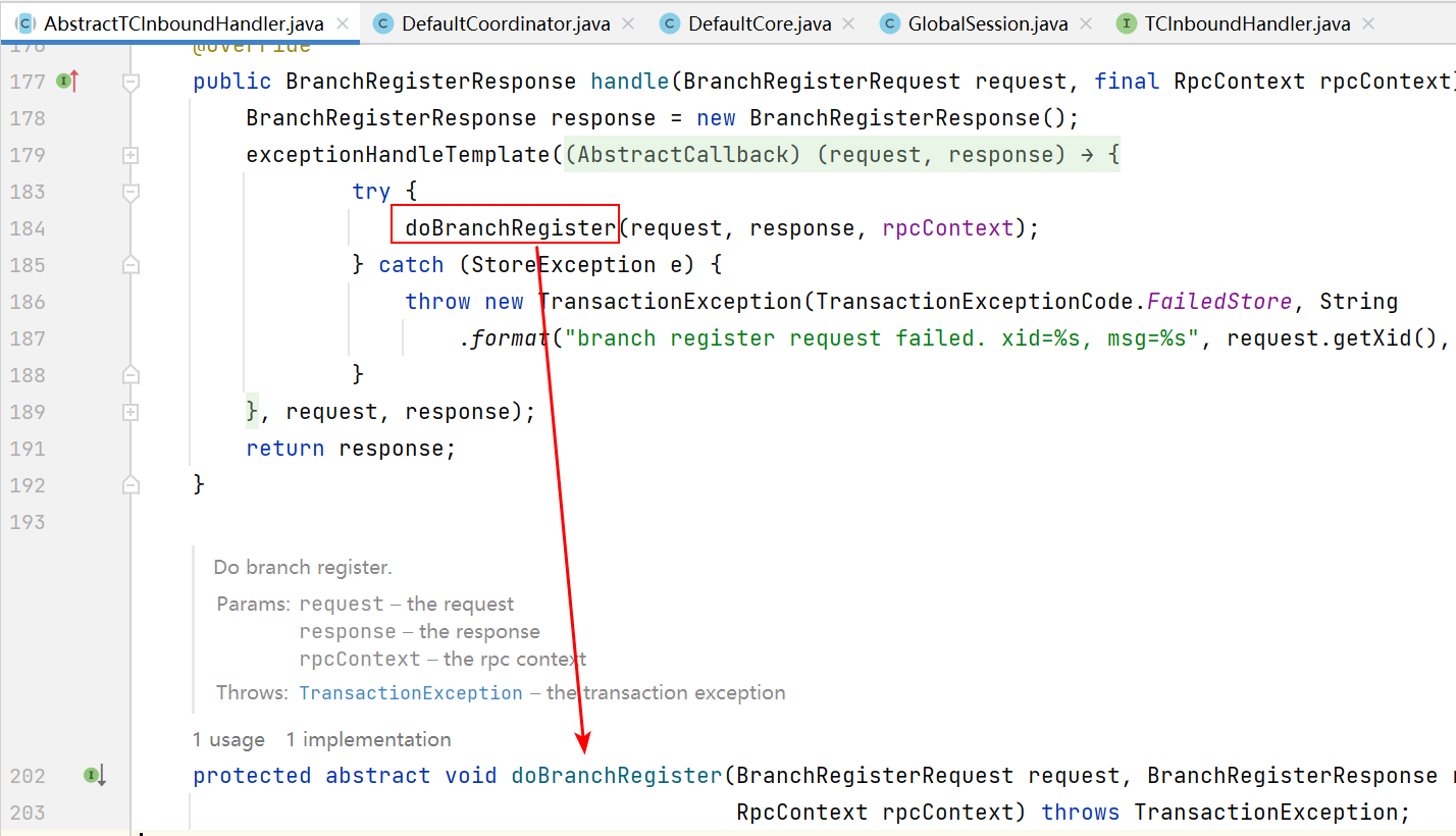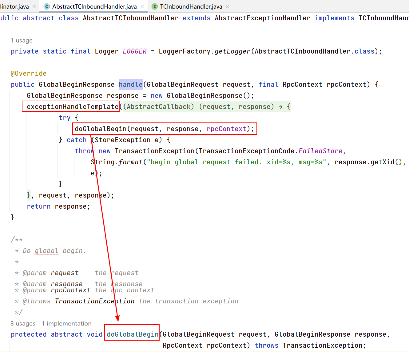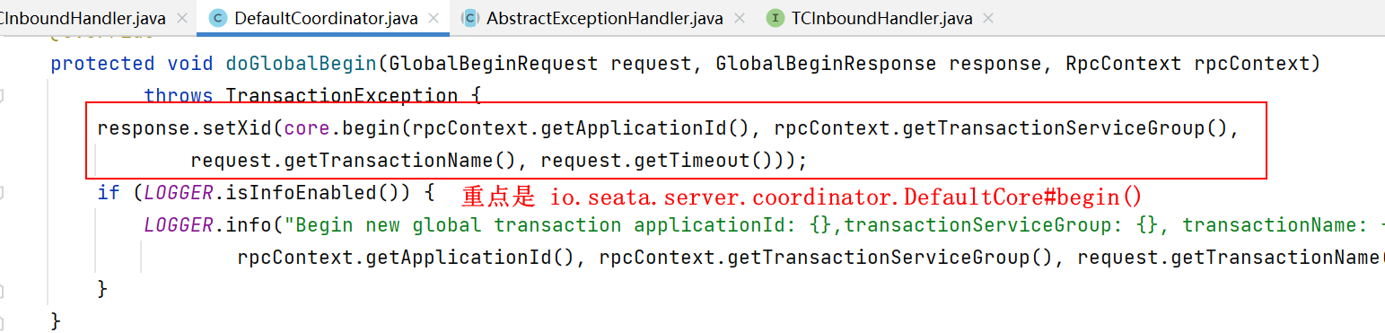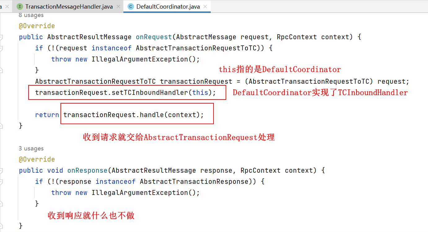 这里transactionRequest.setTCInboundHandler(this),就是指定AbstractTransactionRequestToTC中的TCInboundHandler设置为DefaultCoordinator