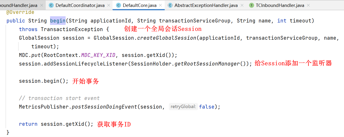 在doGlobalBean()中调用DefaultCore#begin()并返回全局事务ID(xid)