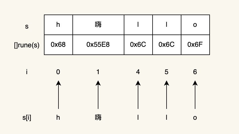 for i, v := range s { // 此处改为获取v,可以获取到字符本身