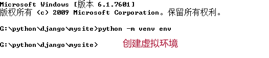 2 新建文件夹–>搭建虚拟环境,新建一个项目文件夹 mysite,在当前文件夹cmd输入指令 env (虚拟环境名称),创建虚拟环境