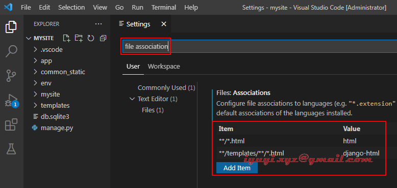 3 在VScode 工作区的 mysite/.vscode/settings.json 文件里添加如下内容