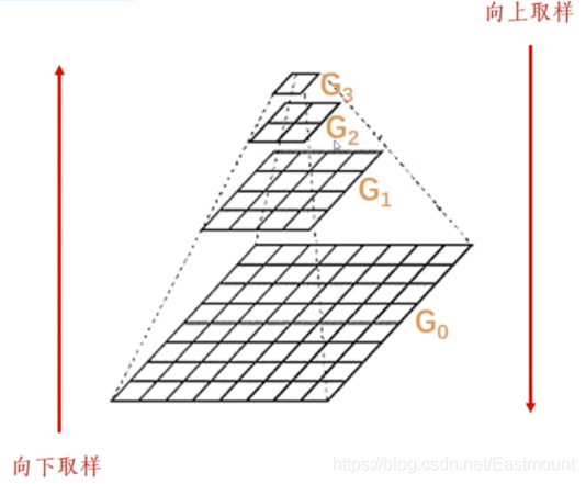 显而易见,原始图像Gi具有M×N个像素,进行向下取样之后,所得到的图像Gi+1具有M/2×N/2个像素,只有原图的四分之一。通过对输入的原始图像不停迭代以上步骤就会得到整个金字塔。注意,由于每次向下取样会删除偶数行和列,所以它会不停地丢失图像的信息。