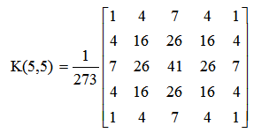 在图像向下取样中,使用最多的是高斯金字塔。它将对图像Gi进行高斯核卷积,并删除原图中所有的偶数行和列,最终缩小图像。其中,高斯核卷积运算就是对整幅图像进行加权平均的过程,每一个像素点的值,都由其本身和邻域内的其他像素值(权重不同)经过加权平均后得到。常见的3×3和5×5高斯核如下: