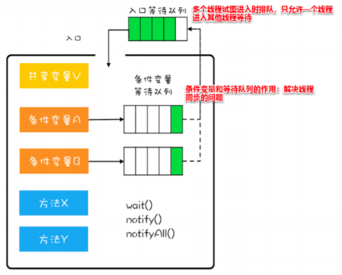 条件变量等待队列:这个是为已获得锁的成员进入等待阻塞准备的,当需要等待条件满足时,为了更好的利用CPU,让线程进入等待阻塞,而什么时候再次获得锁,也就是当等待的条件满足了,就会从这个队列中出去,进入到入口等待队列中,再次获取锁。