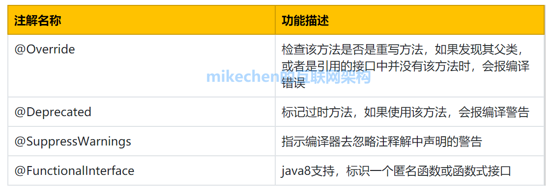 包括@Override、@Deprecated、@SuppressWarnings等,使用这些注解后编译器就会进行检查。