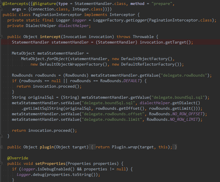 - intercept:在此实现自己的拦截逻辑,可从Invocation参数中拿到执行方法的对象,方法,方法参数,从而实现各种业务逻辑, 如下代码所示,从invocation中获取的statementHandler对象即为被代理对象,基于该对象,我们获取到了执行的原始SQL语句,以及prepare方法上的分页参数,并更改SQL语句为新的分页语句,最后调用invocation.proceed()返回结果。