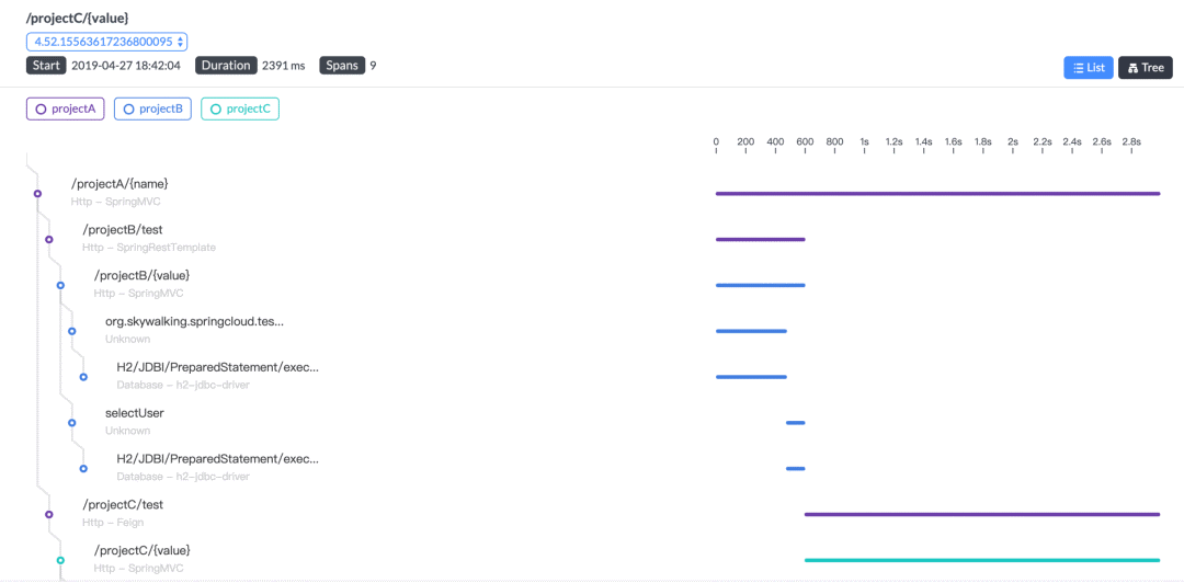 从上面这个图中,可以非常方便地看出,这个请求经过了 3 个应用,通过线的长短可以非常容易看出各个节点的耗时情况。通常点击某个节点,我们可以有更多的信息展示,比如点击 HttpClient 节点我们可能有 request 和 response 的数据。