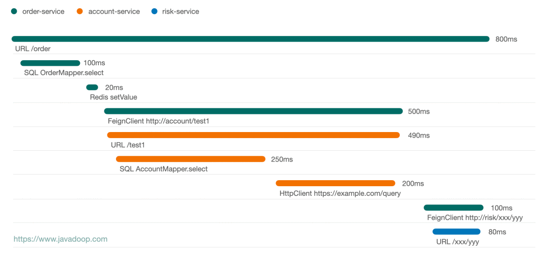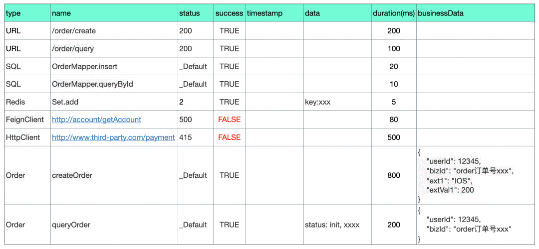 - type 为 URL、SQL、Redis、FeignClient、HttpClient 等这些数据,属于自动埋点的范畴。通常做 APM 系统的,都要完成一些自动埋点的工作,这样应用开发者不需要做任何的埋点工作,就能看到很多有用的数据。像最后两行的 type=Order 属于手动埋点的数据。