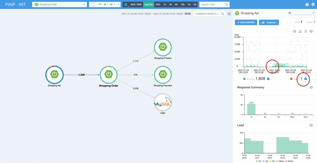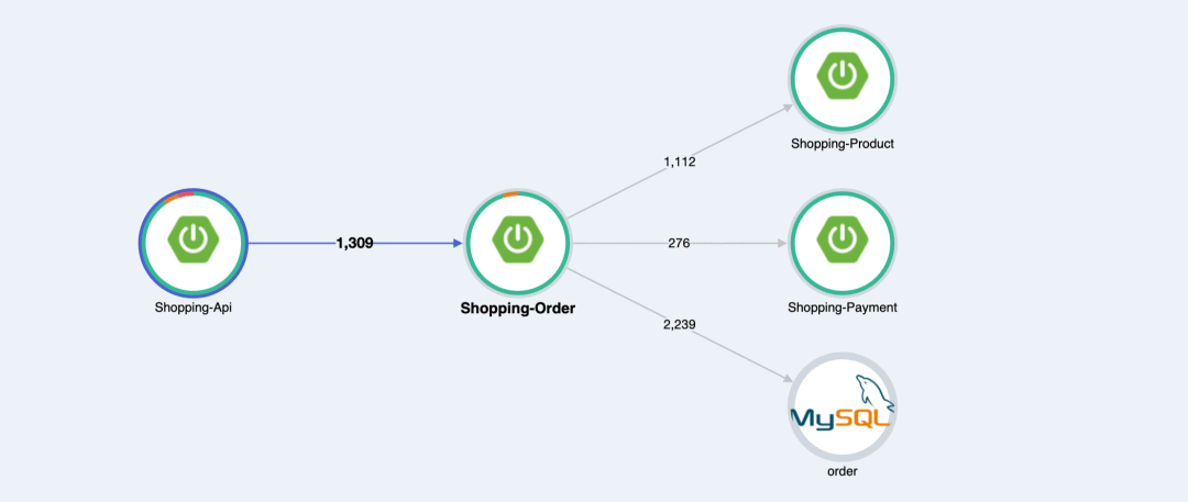 还是看上面这个图,我们看右下角的两个统计图,我们可以看出来在最近 5 分钟内 Shopping-api 调用 Shopping-order 的所有请求的耗时情况,以及时间分布。在发生异常的情况,比如流量突发,这些图的作用就出来了。