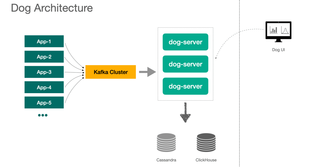 下面是 DOG 的架构图,客户端将消息投递给 Kafka,由 dog-server 来消费消息,存储用到了 Cassandra 和 ClickHouse,后面再介绍具体存哪些数据。