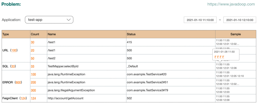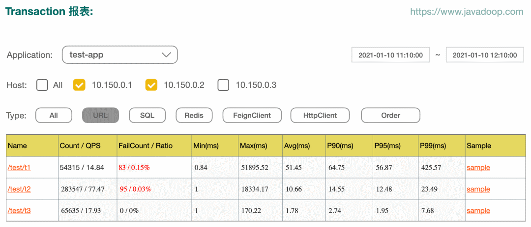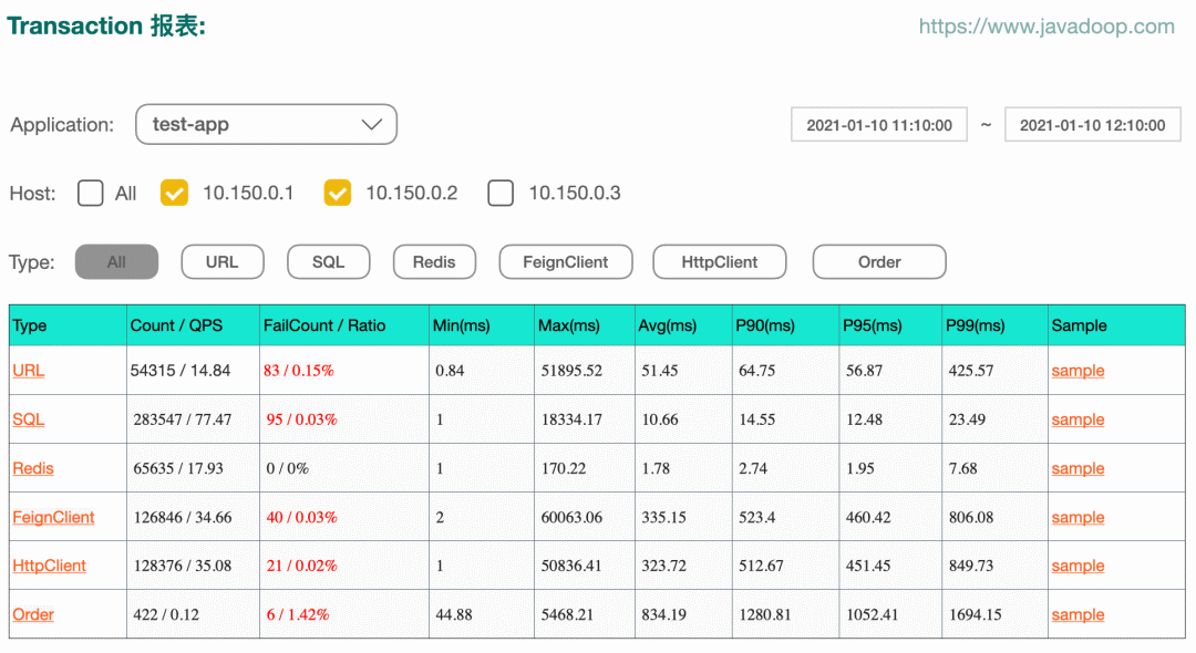 Sample 就是取样的意思,当我们看到有个接口失败率很高,或者 P90 很高的时候,你知道出了问题,但因为它只有统计数据,所以你不知道到底哪里出了问题,这个时候,就需要有一些样本数据了。我们每分钟对 type、name、status 的不同组合分别保存最多 5 个成功、5 个失败、5 个慢处理的样本数据。