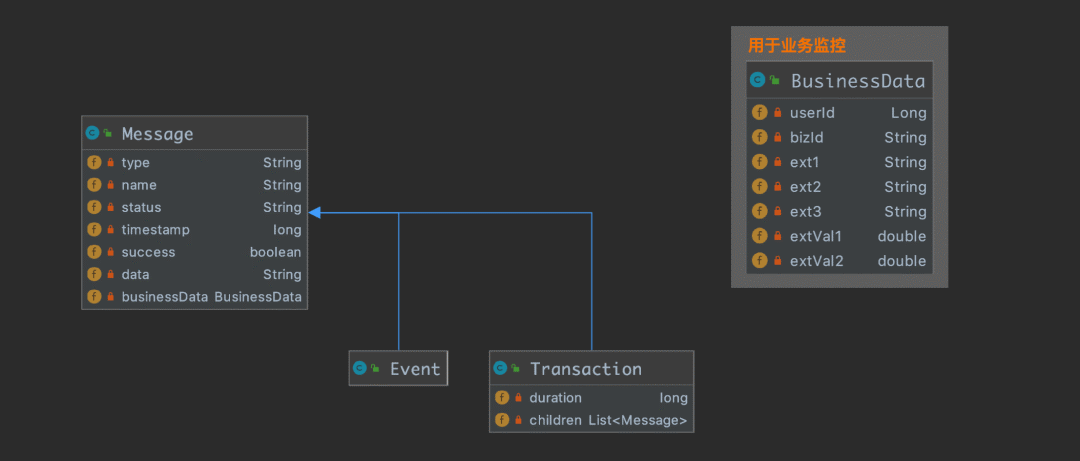 Message 有两个子类 Event 和 Transaction ,区别在于 Transaction 带有 duration 属性,用来标识该 transaction 耗时多久,可以用来做 max time, min time, avg time, p90, p95 等,而 event 指的是发生了某件事,只能用来统计发生了多少次,并没有时间长短的概念。