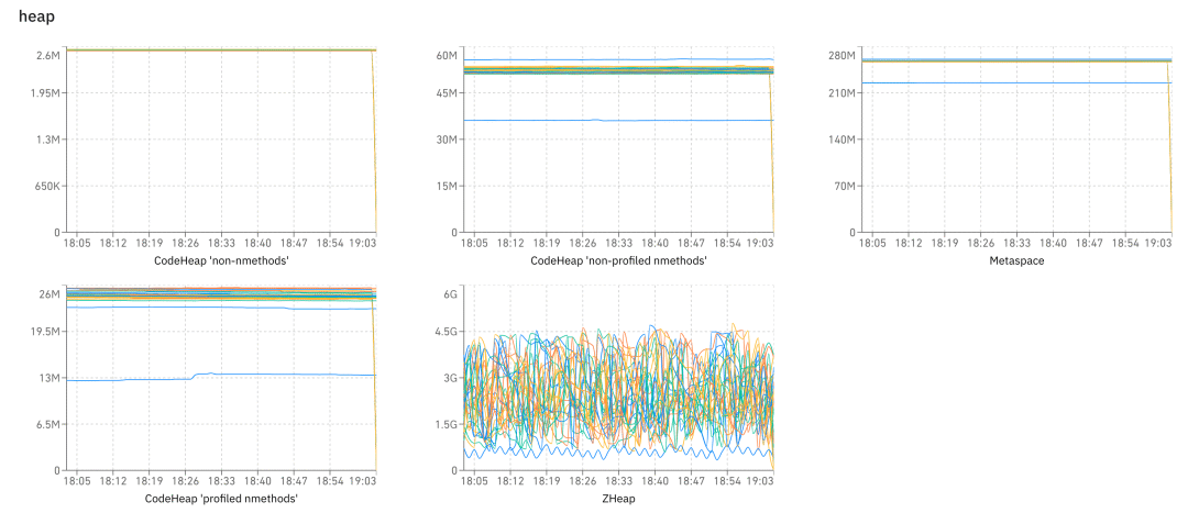 前缀是分类,后缀是图的名称。客户端每分钟收集一次数据进行上报,然后就可以做很多的图了,比如下图展示了在 heap 分类下的各种图:
