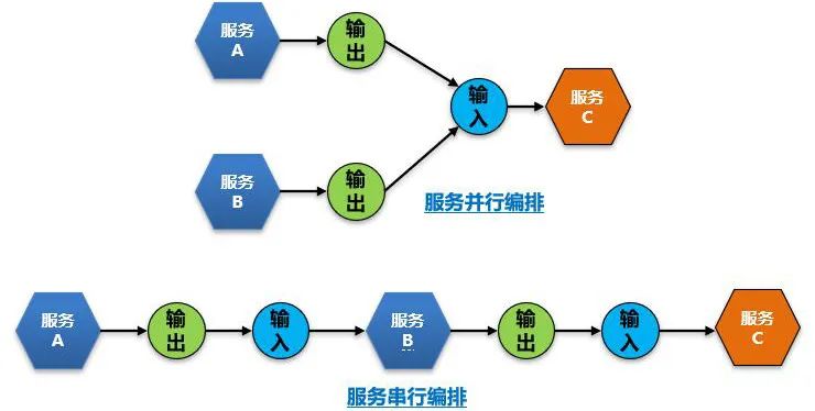 这个是我们经常看到的一种服务编排场景,即A,B,C三个服务直接进行编排,即A服务的输出直接变为B服务的输入,B服务的输出又变为C服务的输出。如果仅仅是上面假设的这样,那么这种流程式的服务编排仍然很简单,也很容易去实现。