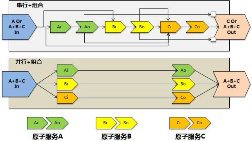 对多个原子服务进行流程式的前后串接并形成服务提供