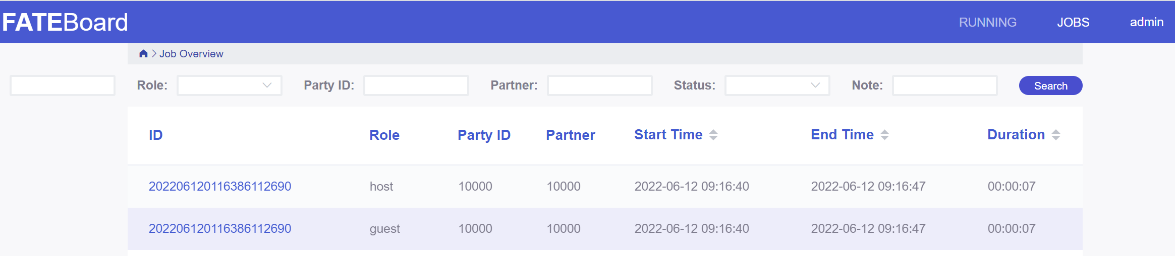 FATE Board 是 Fate 里面负责可视化的服务组件,在单机版容器中已经集成了该服务,可以通过 8080 端口访问: