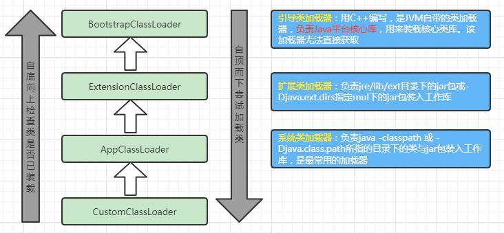 直到BootstrapClassLoader,已经没有父加载器了,这是开始考虑自己是否能加载了,如果自己不能加载,则下沉到子类加载器去加载,直到最底层