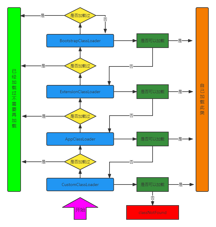- 父类加载器一层层向下分派任务,如果子类加载器能加载则加载此类,如果直到系统类加载器也无法加载,则抛出异常。