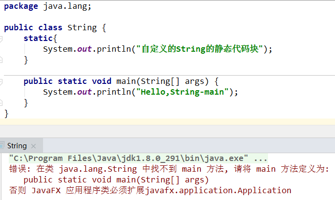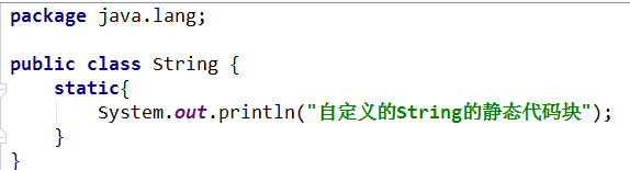从输出结果可以看到,程序并没有输出静态代码块的内容,自定义String类并没有被加载,所以加载的是JDK内置的String类