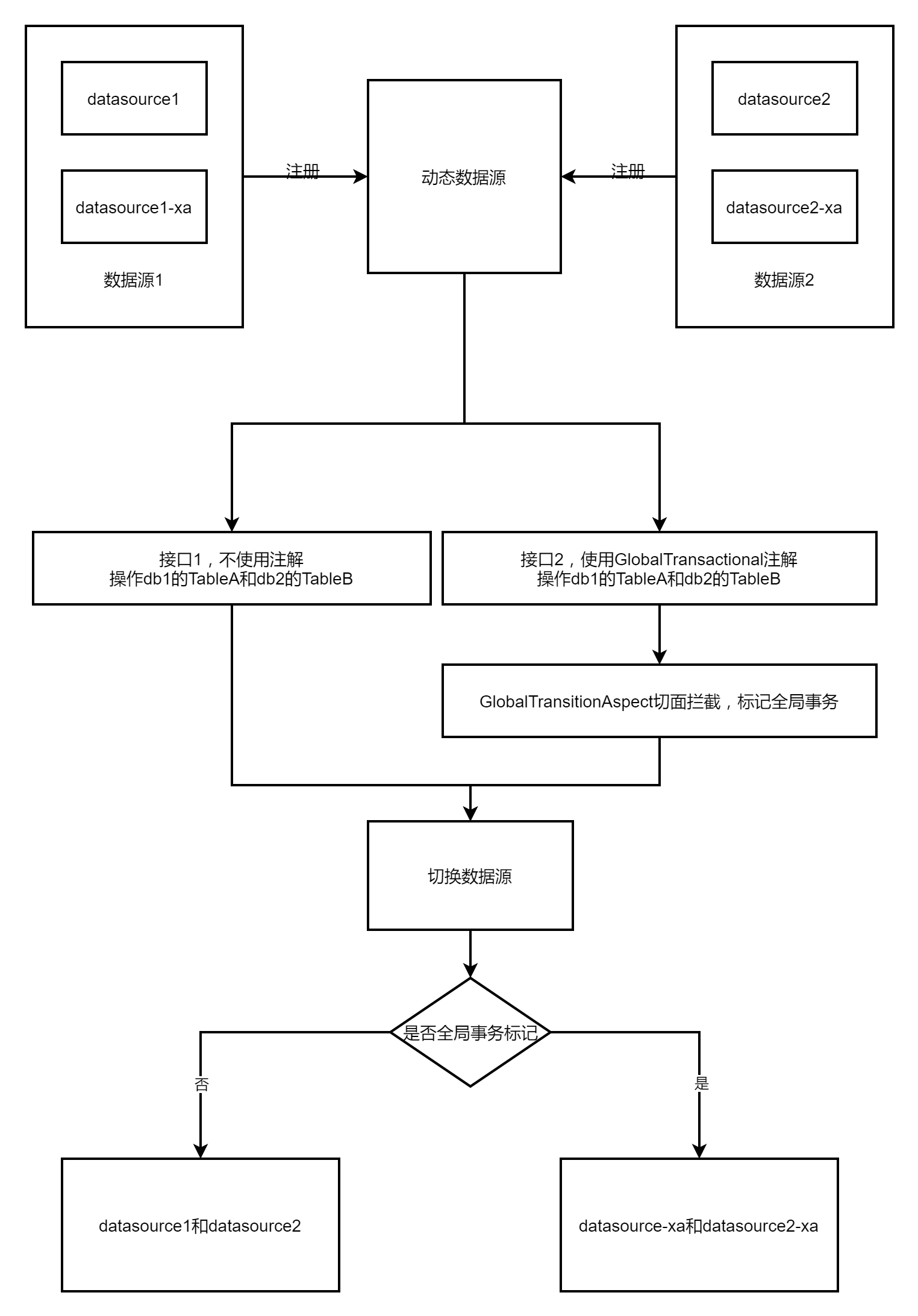 因为spring默认注册了XA事务管理器后,所有事务操作不再走本地事务,我们通过切换不同的数据源决定走本地事务还是XA事务