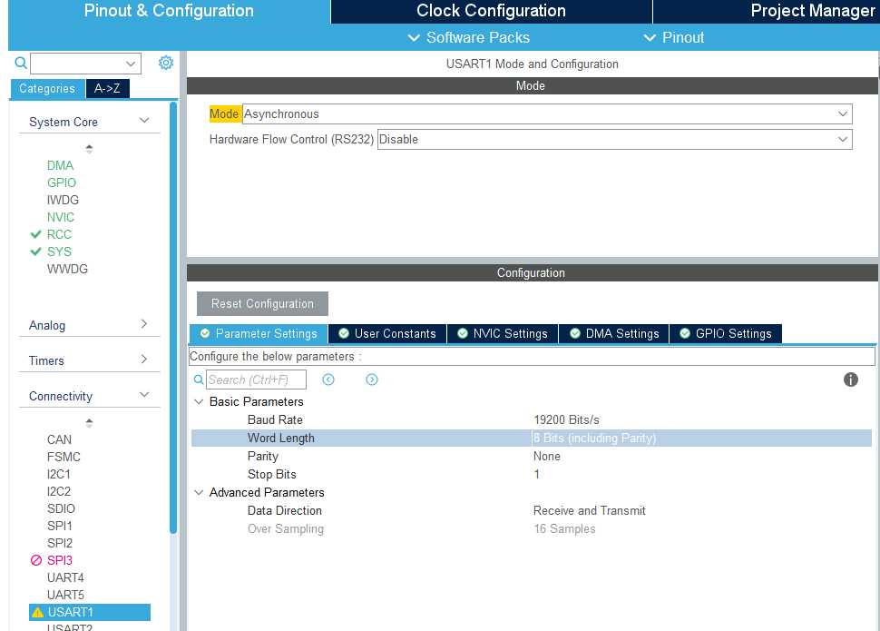 串口配置: 异步,波特率:19200,每帧:1字节;无校验;1停止位