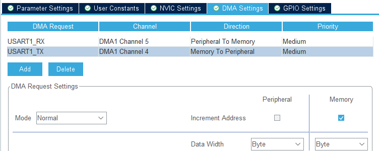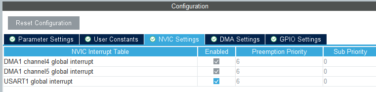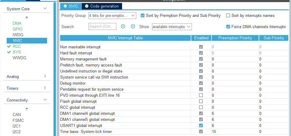 中断设置:考虑到后期使用freertos,可控制中断配置为:4位抢占优先级,15>=中断优先级级>=5(越低,优先级越高)