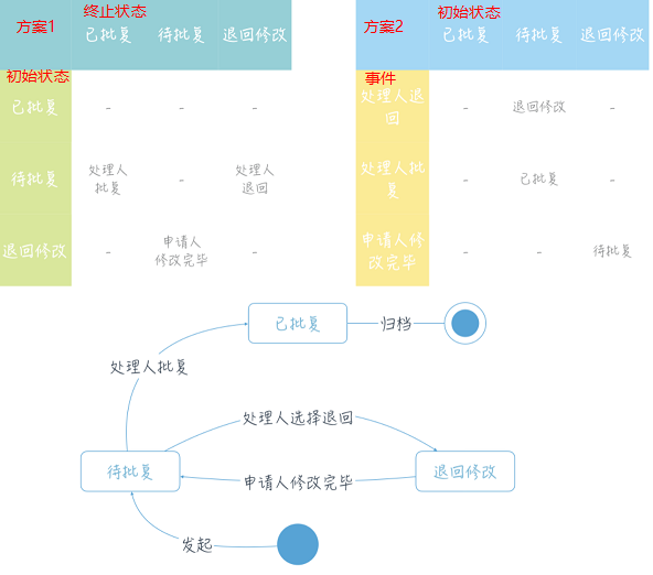 状态命名形式: 1.副词+动词;例如:待审批、待支付、待收货 这种命名方式体现了:状态机就是事件触发状态不断迁徙的本质。表达一种待触发的感觉。 2.动词+结果;例如:审批完成、支付完成 3.已+动词形式;例如:已发货、已付款 以上两种命名方式体现了:状态是一种结果或者稳态的本质。表达了一种已完成的感觉。