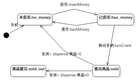下面使经典的自动贩卖机例子来说明状态模式的用法,状态图如下: