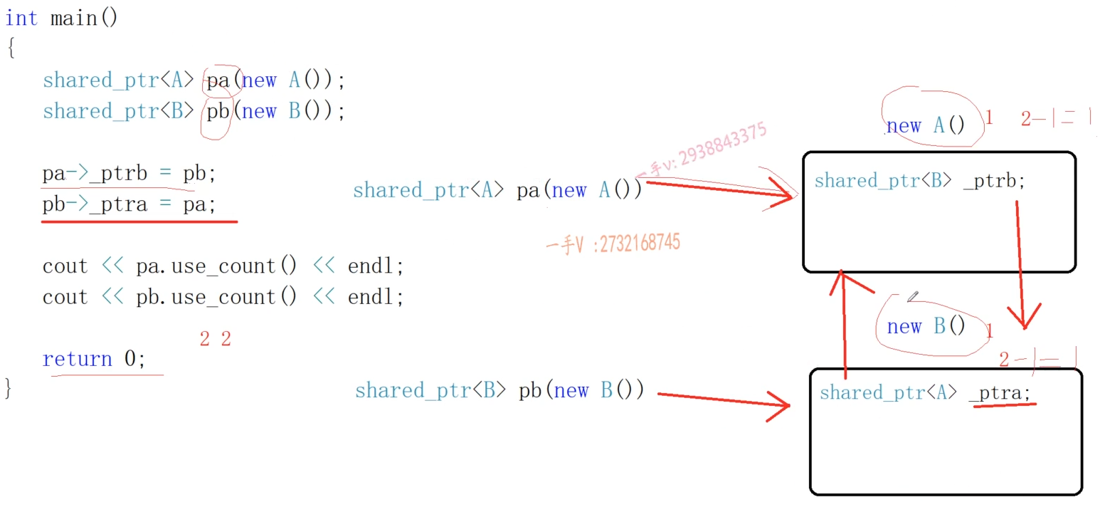 ptrb->_ptra = ptra;// B对象的成员变量_ptra也指向A对象,A的引用计数为2