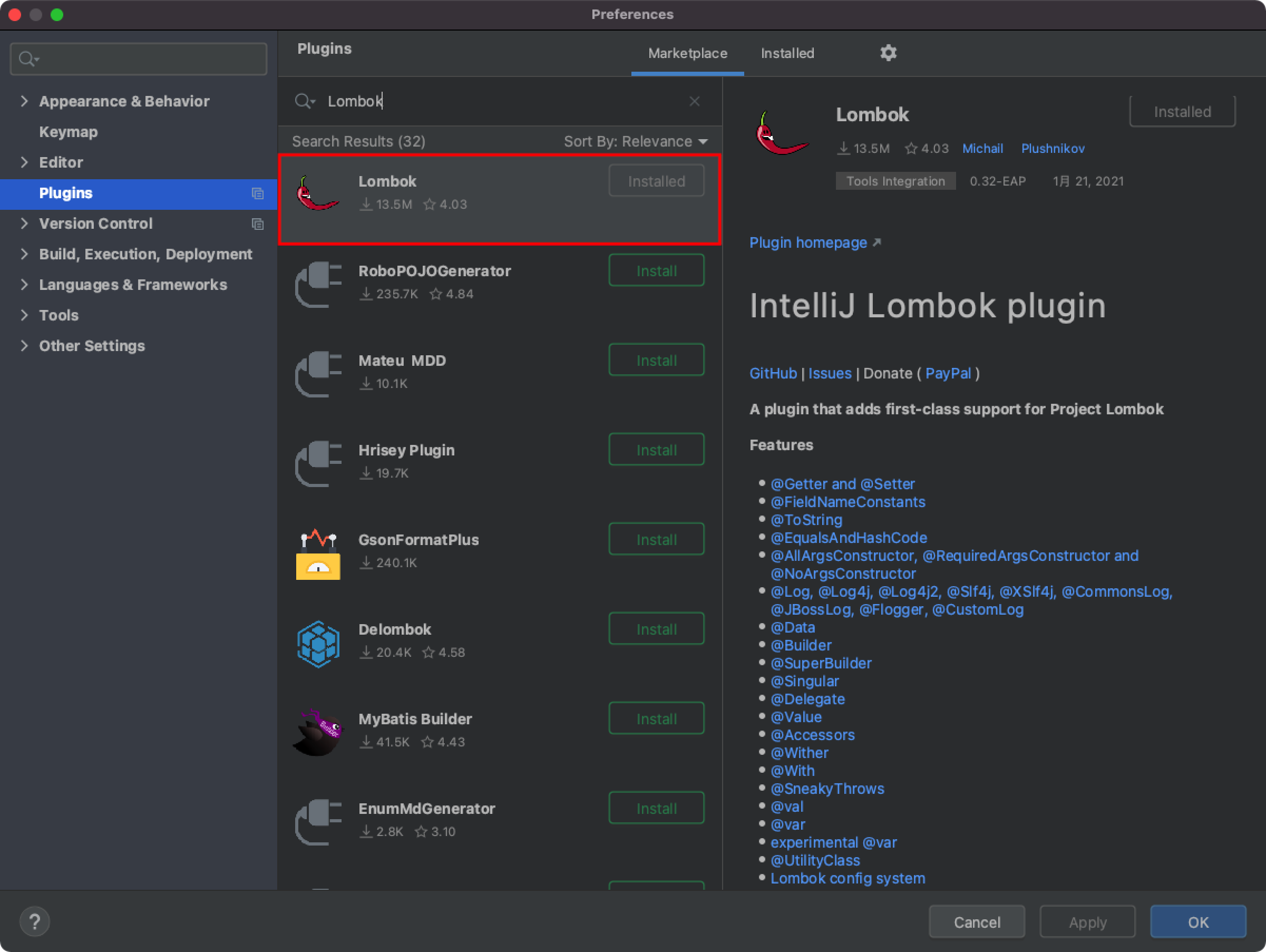 使用lombok需安装lombok插件,如果已安装此处可忽略。