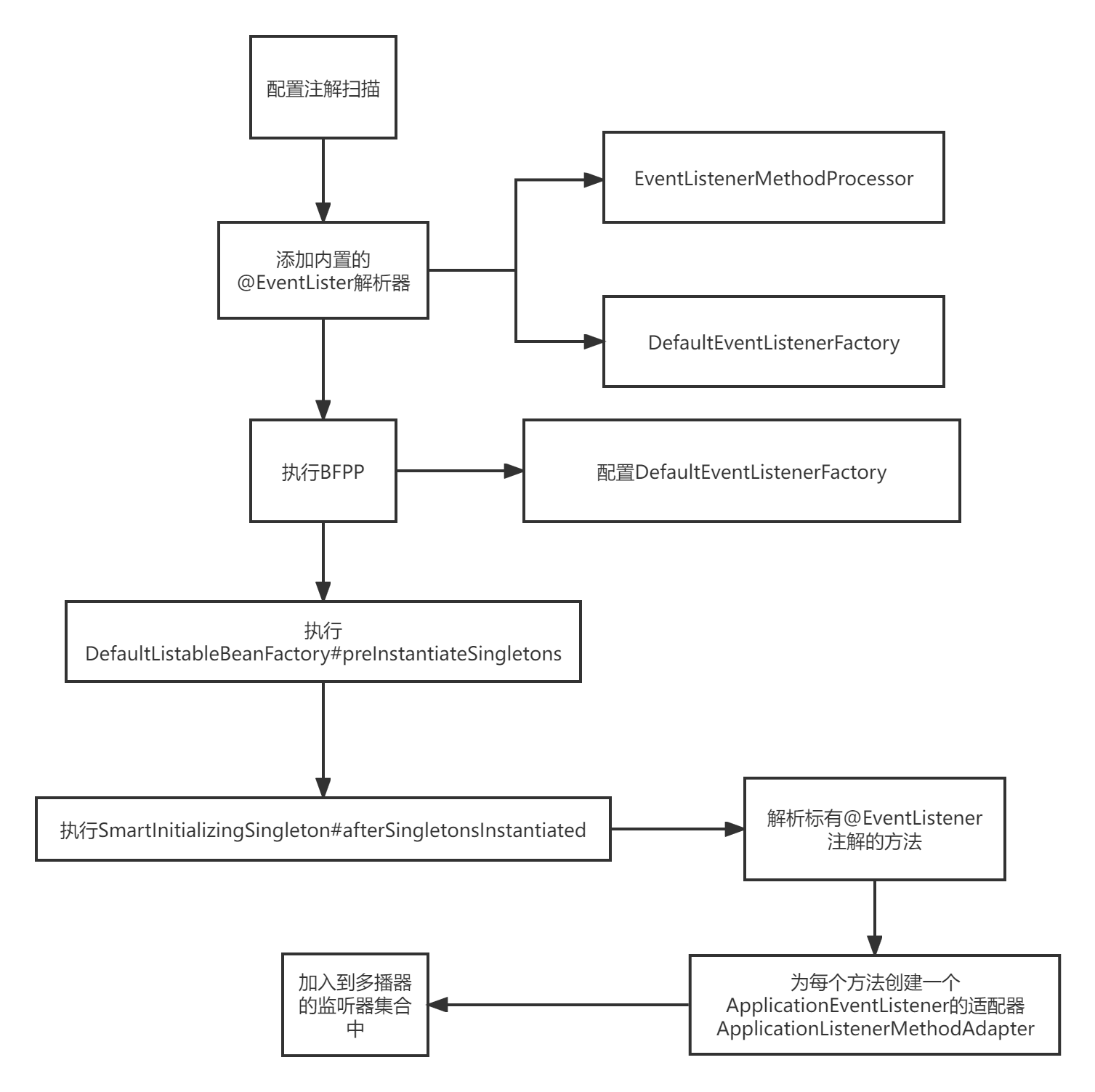 可以看到设置了一个EventListenerMethodProcessor类还有一个DefaultEventListenerFactory,这两个类分别用来解析@EvenListener和创建ApplicationListener接口的适配器。